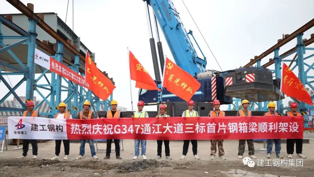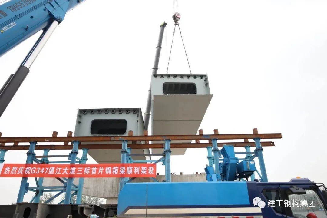 此次钢箱梁架设,钢构公司做了充足的准备,对桥梁钢箱梁结构、现场实际地形等进行了详细的分析调研,并邀请多位专家对吊装方案把关评审,不断优化完善吊装专项施工方案和安全管理方案,实施多方联动机制。在正式吊装作业前,对参与施工的作业人员进行细致的技术交底,理清每一个操作步骤,对各个环节实施精准把控。在现场指挥人员和作业人员的密切配合下,该钢箱梁顺利落位完成吊装,标志着G347项目正式开始主桥钢箱梁施工,为G347通江大道建成通车打下了坚实基础。