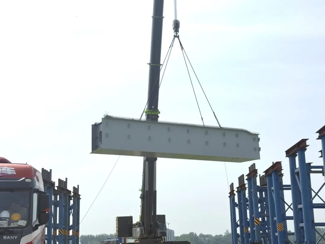 此次吊装的钢箱梁跨度达65米,单件最大重量49.5吨,最大安装高度10.5米,施工团队克服了构件重量大、吊装精度高及地质条件复杂等挑战,采用高精度测量技术,确保钢箱梁精准就位。丰乐河施工点共需架设24片钢混组合梁,总重量约870吨。作为项目关键节点之一,该工程已相继完成山王河、张母河桥及桃溪南主线互通等多个重要施工任务。